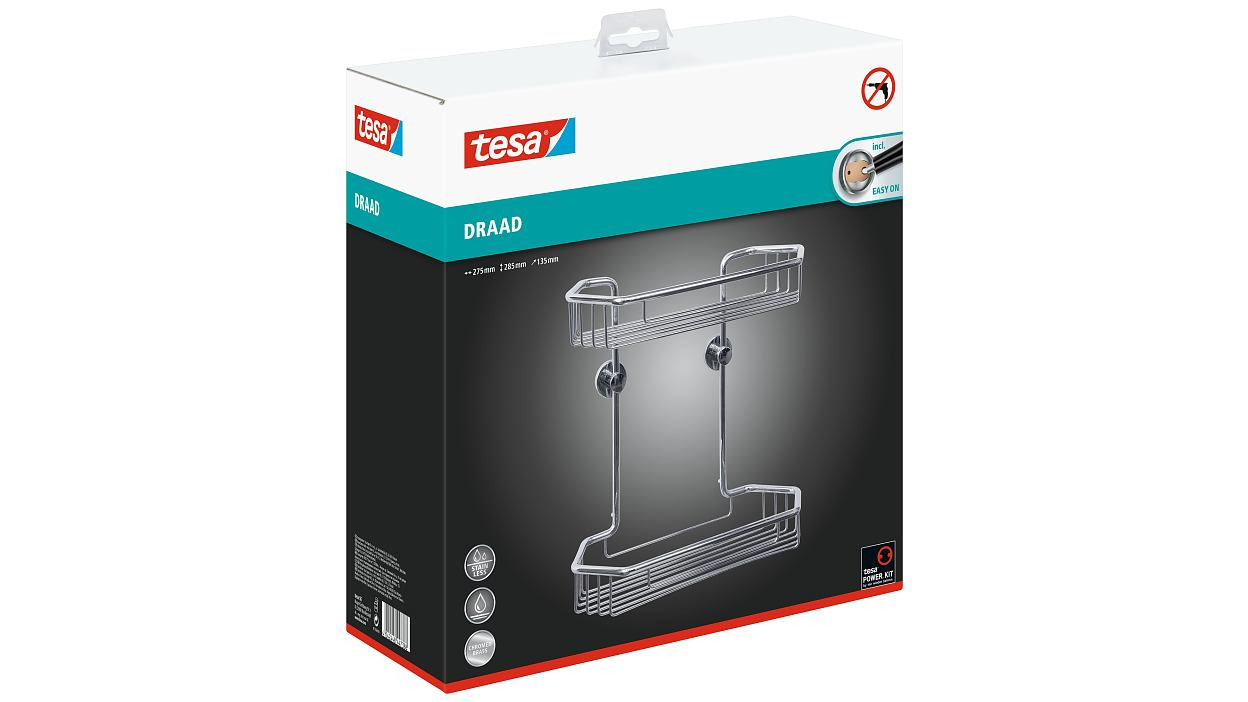 Il est bon d'avoir des gels douche et des shampooings au même endroit lorsque vous êtes sous la douche. Avec l'étagère 2 paniers tesa® Draad, non seulement vous obtenez un bel aspect hexagonal, mais vous pouvez le monter où vous voulez, grâce à la colle utilisée. L'absence de perçage permet de préserver les murs et les carrelages. La colle doit durcir pendant 12 heures. L'étagère 2 paniers peut être retirée à votre guise sans laisser de traces. Elle peut être également facilement réinstallé ailleurs avec un nouvel adaptateur BK43-2.