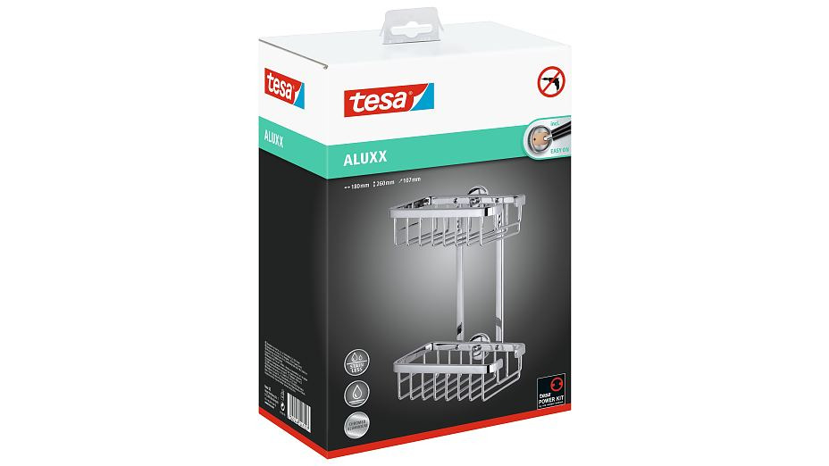 - Étagère de douche avec technologie tesa® Power.Kit brevetée (solution de fixation complète)