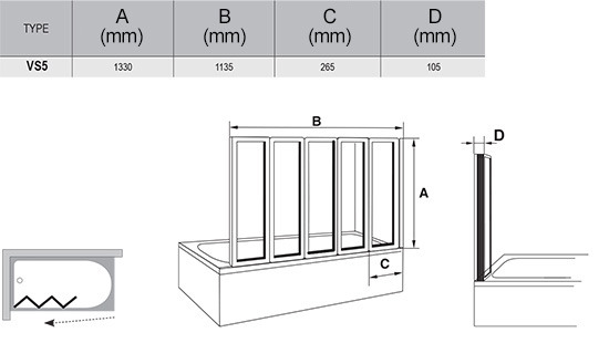 Caractéristiques du Pare-baignoire pliable, 5 parties, 133x100cm, Blanc, Ravak Supernova (VS5R0) :