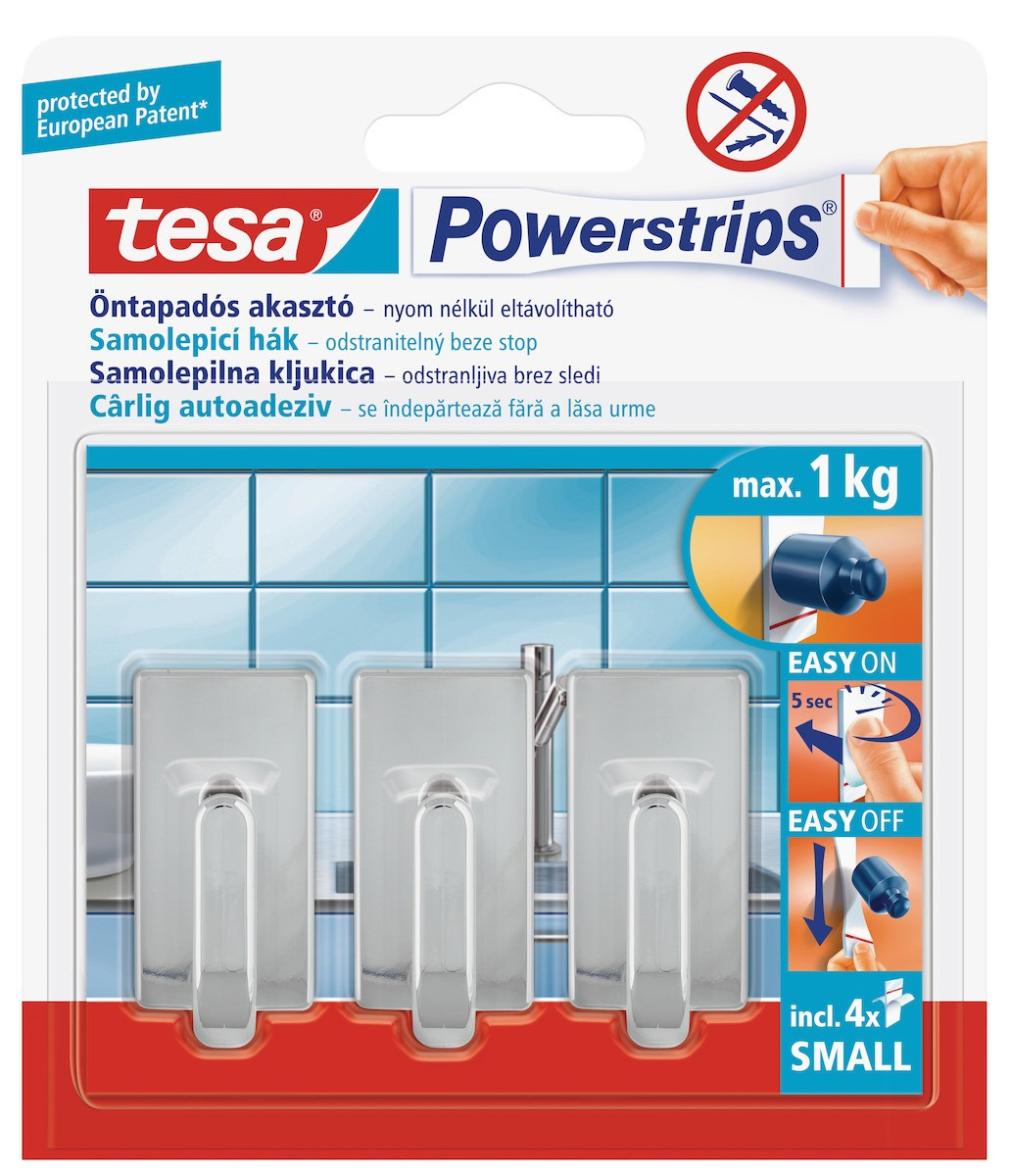 Tesa Powerstrips 3 petits crochets, chrome, pose facile sans perçage (57540-00101-00)