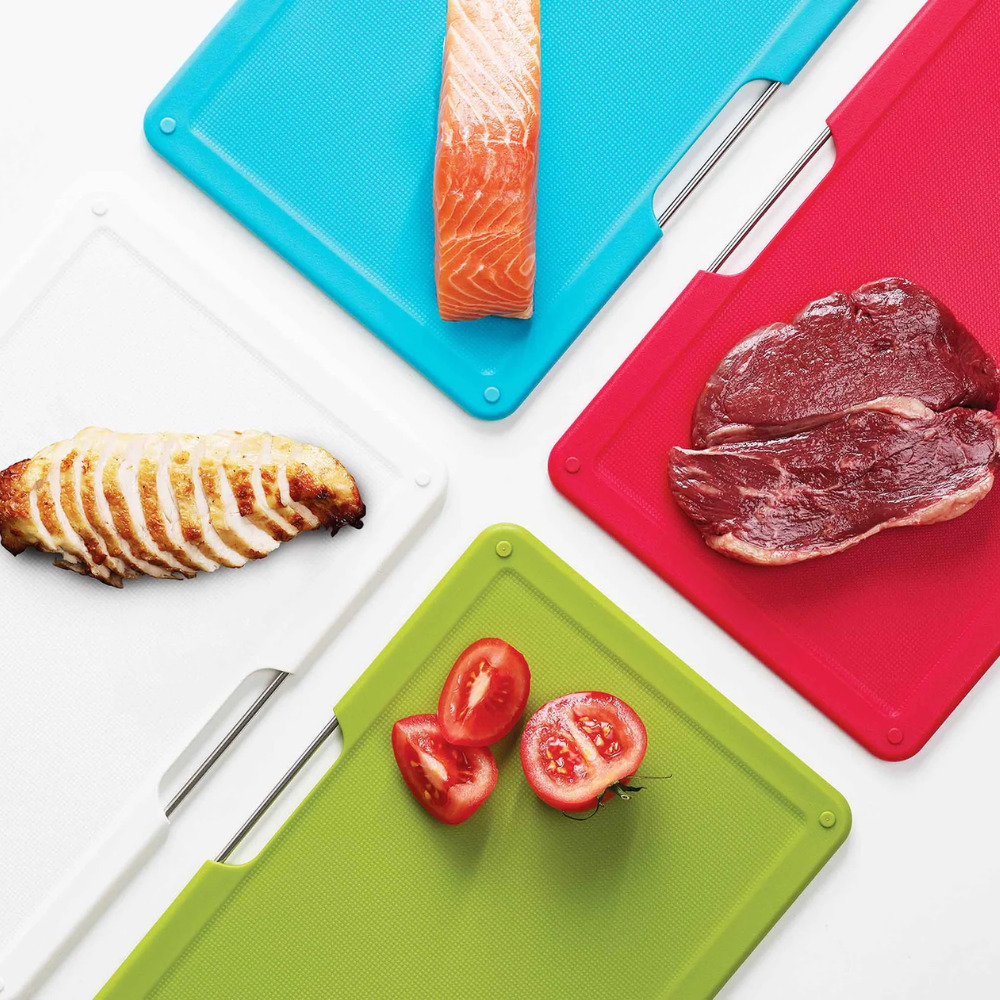 Cet ensemble élégamment conçu, comprend un étui de rangement fin et quatre grandes planches à code couleur, double face, à la surface de coupe texturée et adaptée aux couteaux. Pieds antidérapants. Couteau de chef gratuit avec porte-outil intégré et gaine de protection inclus.