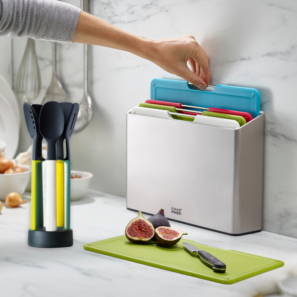 Joseph Joseph Ensemble de 5 ustensiles de cuisine + 4 planches à découper + couteau lame japonaise en acier inoxydable