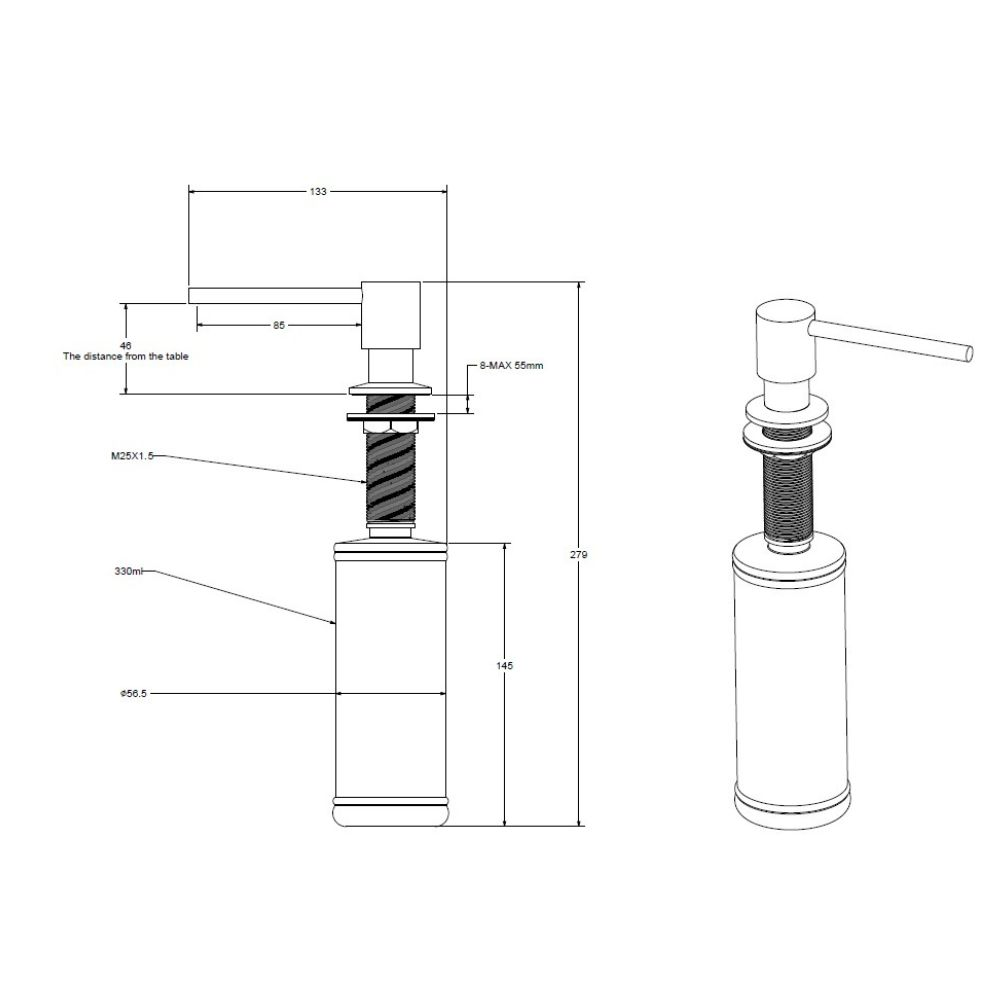 Distributeur de savon ou de détergent en Chrome. La pompe est en laiton. Remplissage pratique de savon ou de détergent en retirant simplement la pompe du Distributeur et en la remettant en place, sans rien avoir à Tournevis. Montage par perçage.