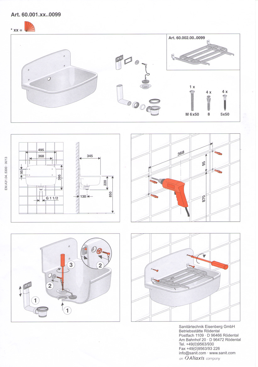 - Complet avec trop-plein, bonde DN 40 1 1/2", tamis, bouchon avec chaîne et kit de fixation