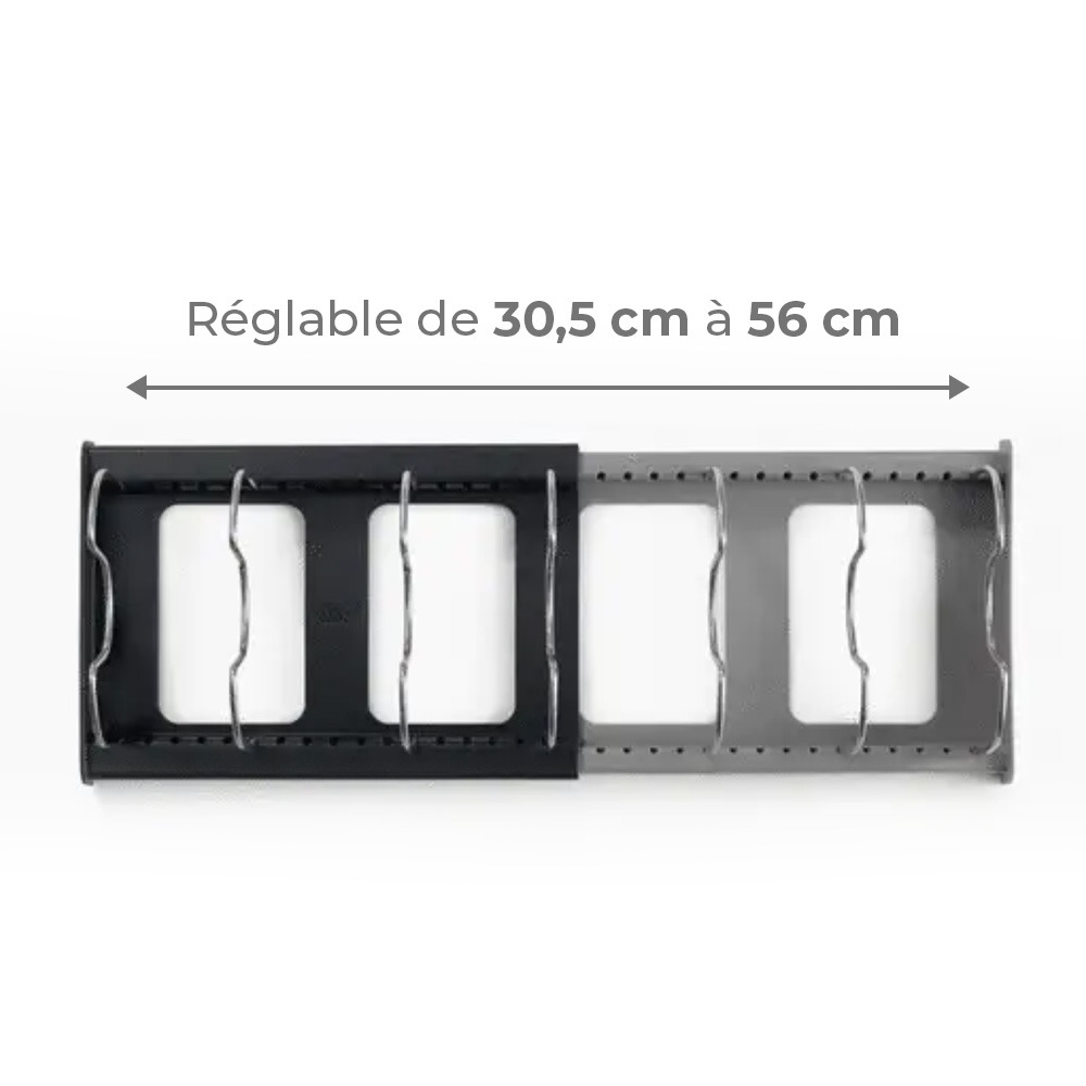 - Comprend 7 séparateurs réglables en fil métallique anti-rayures avec des fentes pour des poignées de casserole