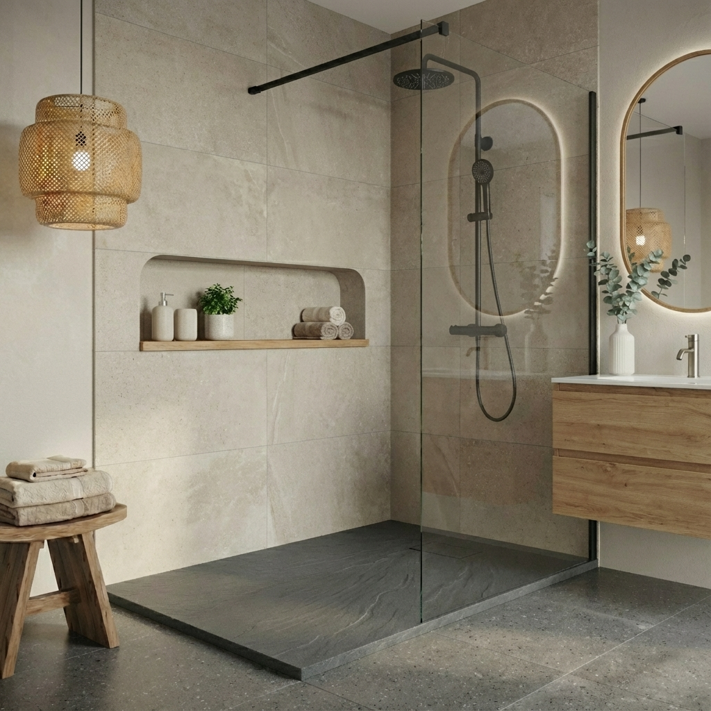 Effet pierre réaliste : un design moderne et naturel pour sublimer votre douche.