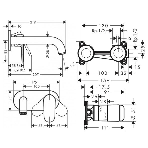 Caractéristiques du Set Mitigeur de lavabo encastré mural, bec 207 mm + Corps d'encastrement, Noir mat (71576670-SET) :