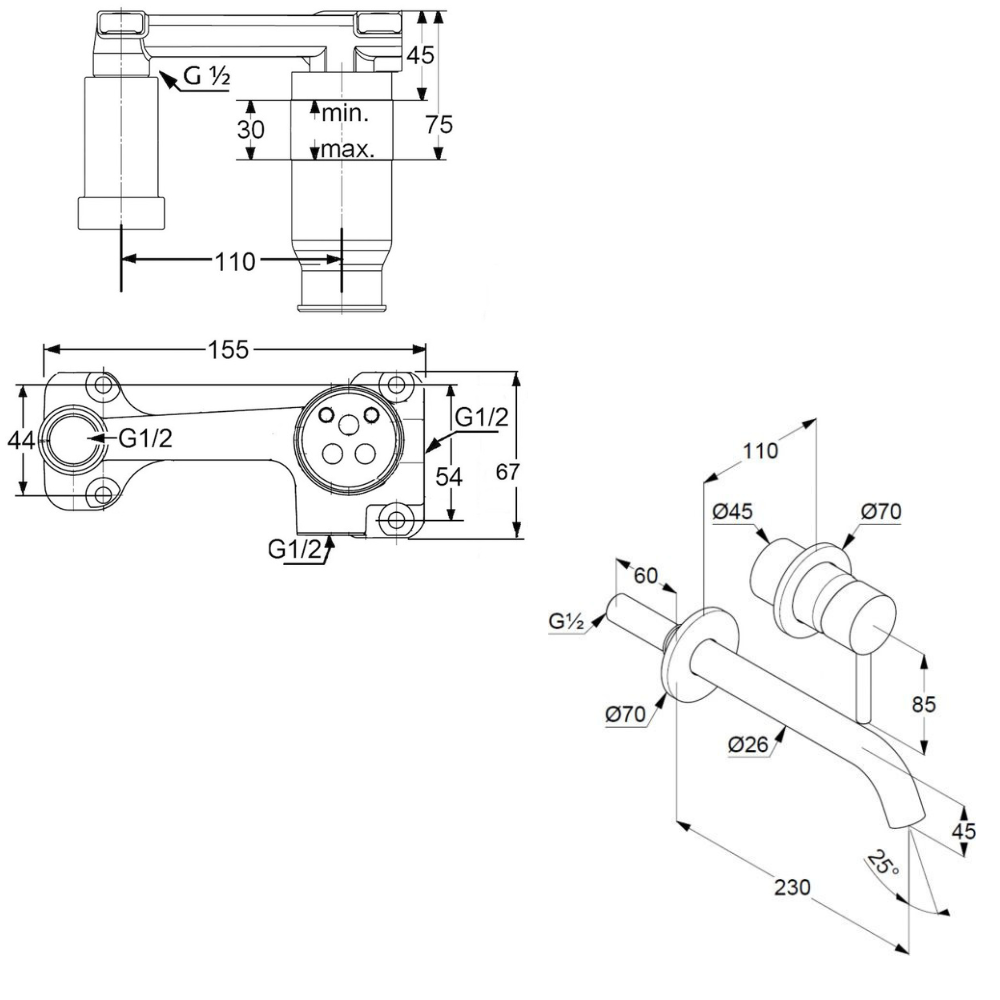 - pour mitigeur de lavabo 2 trous à encastrer pour montage mural