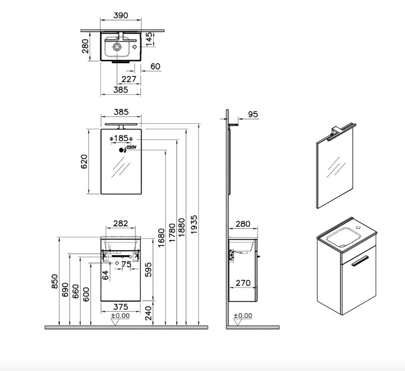 Vitra Mia ensemble meuble 39x61x28 cm avec miroir, lavabo et éclairage LED, chêne (MIASET40D)