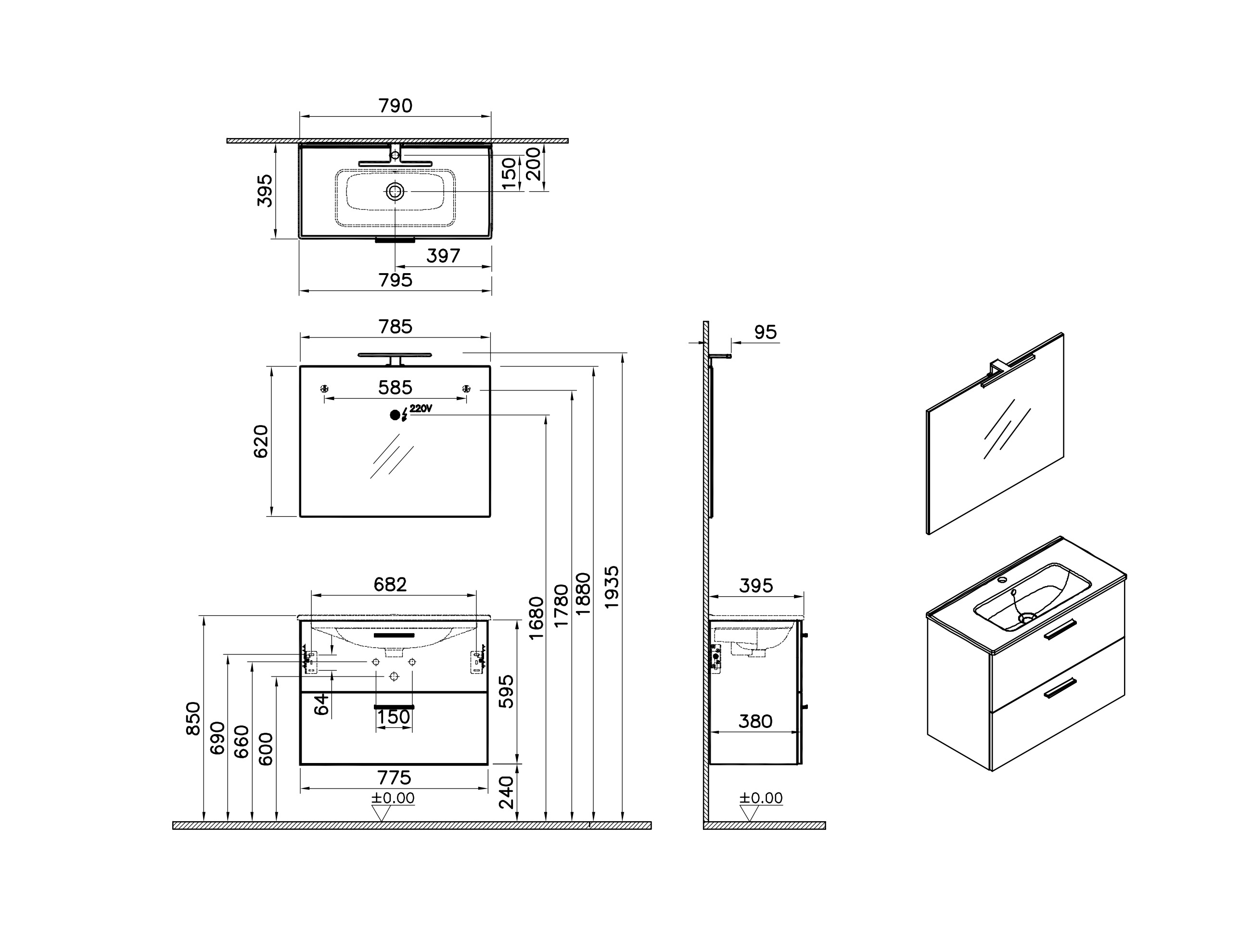 Vitra Set Mia ensemble meuble 79x61x39,5 cm avec miroir, lavabo, éclairage LED + armoire 145x35x35cm, Cordoba