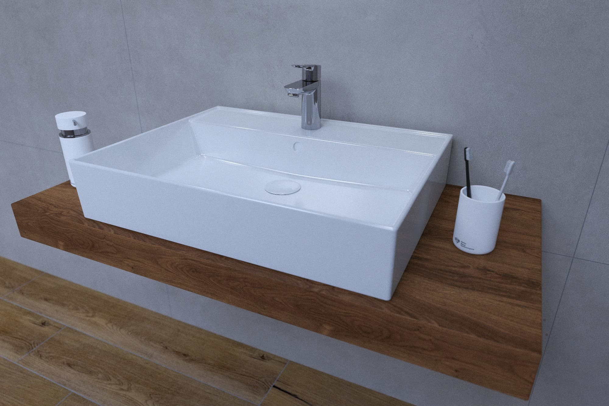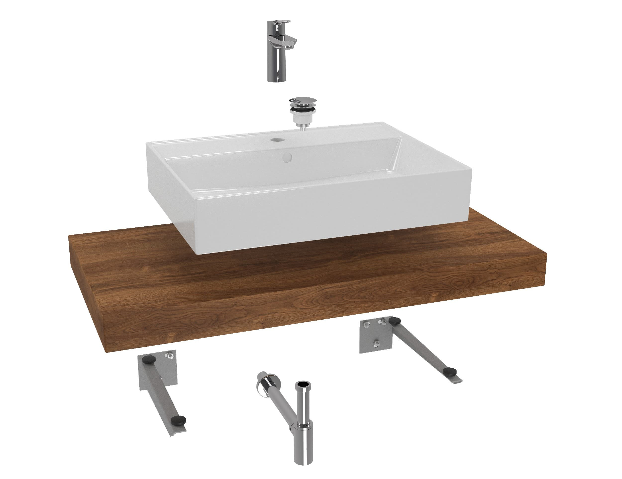 L'ensemble de salle de bain à prix réduit se compose de sept produits : robinet, lavabo, plaque sous le lavabo, bouchon, siphon, console 2x