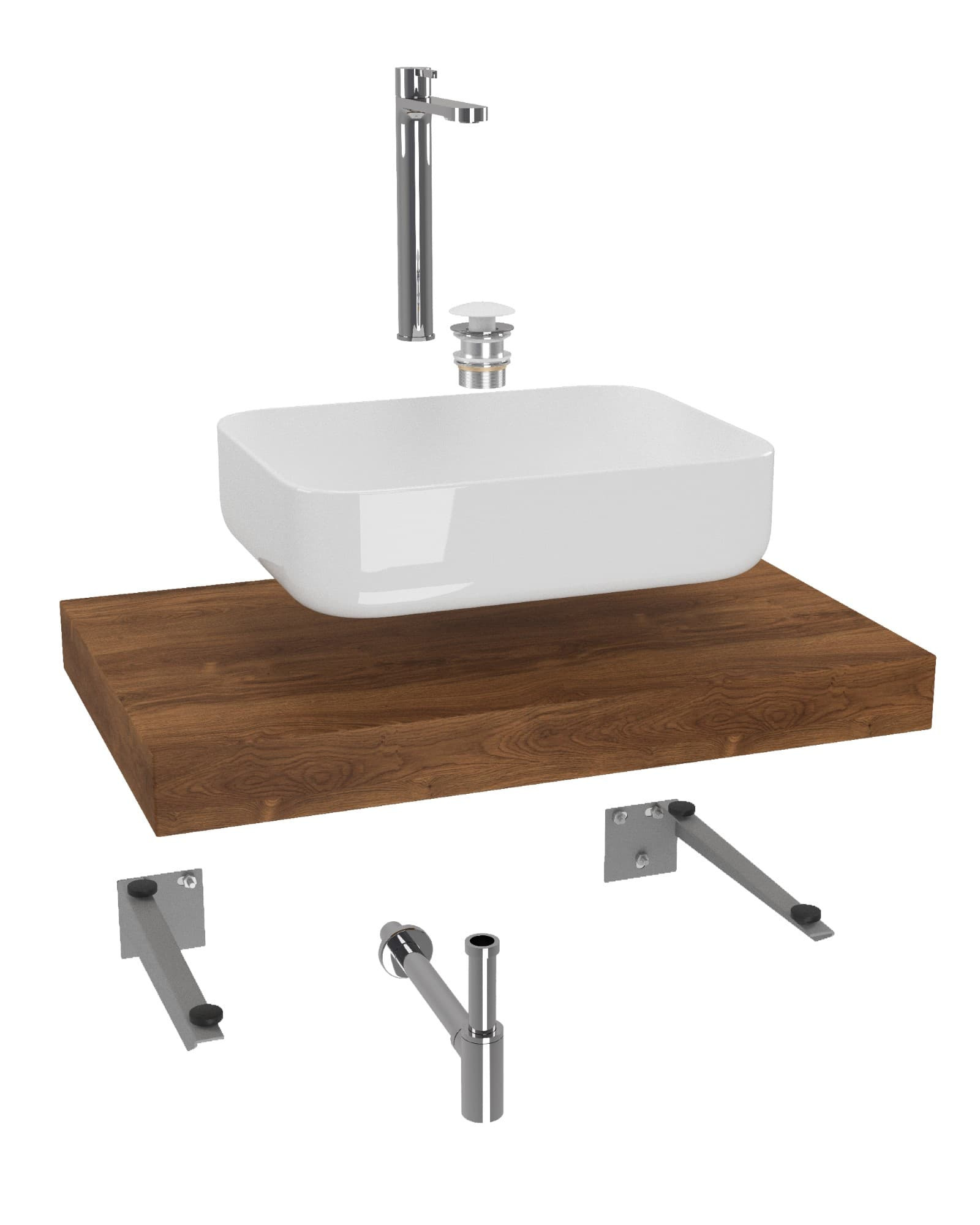 L'ensemble de salle de bain à prix réduit se compose de sept produits : robinet, lavabo, plaque sous le lavabo, bouchon, siphon, console 2x