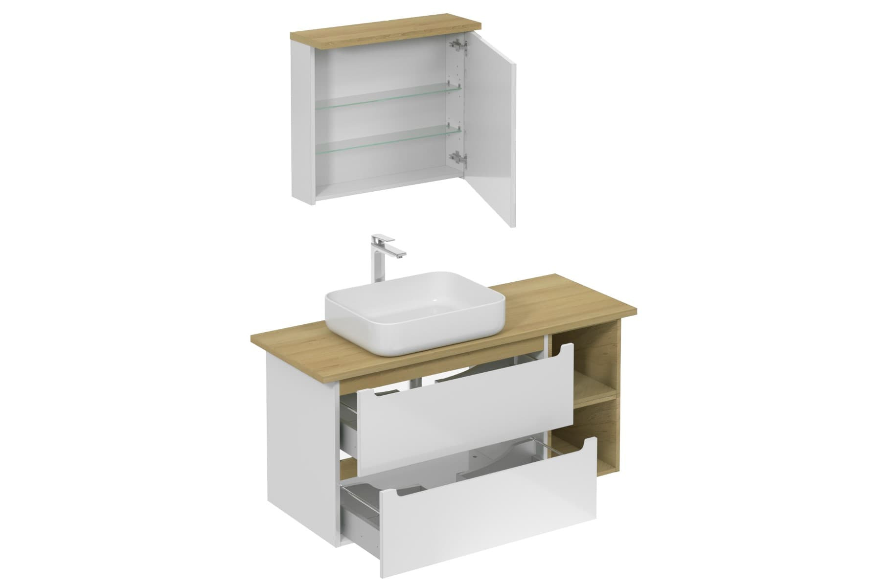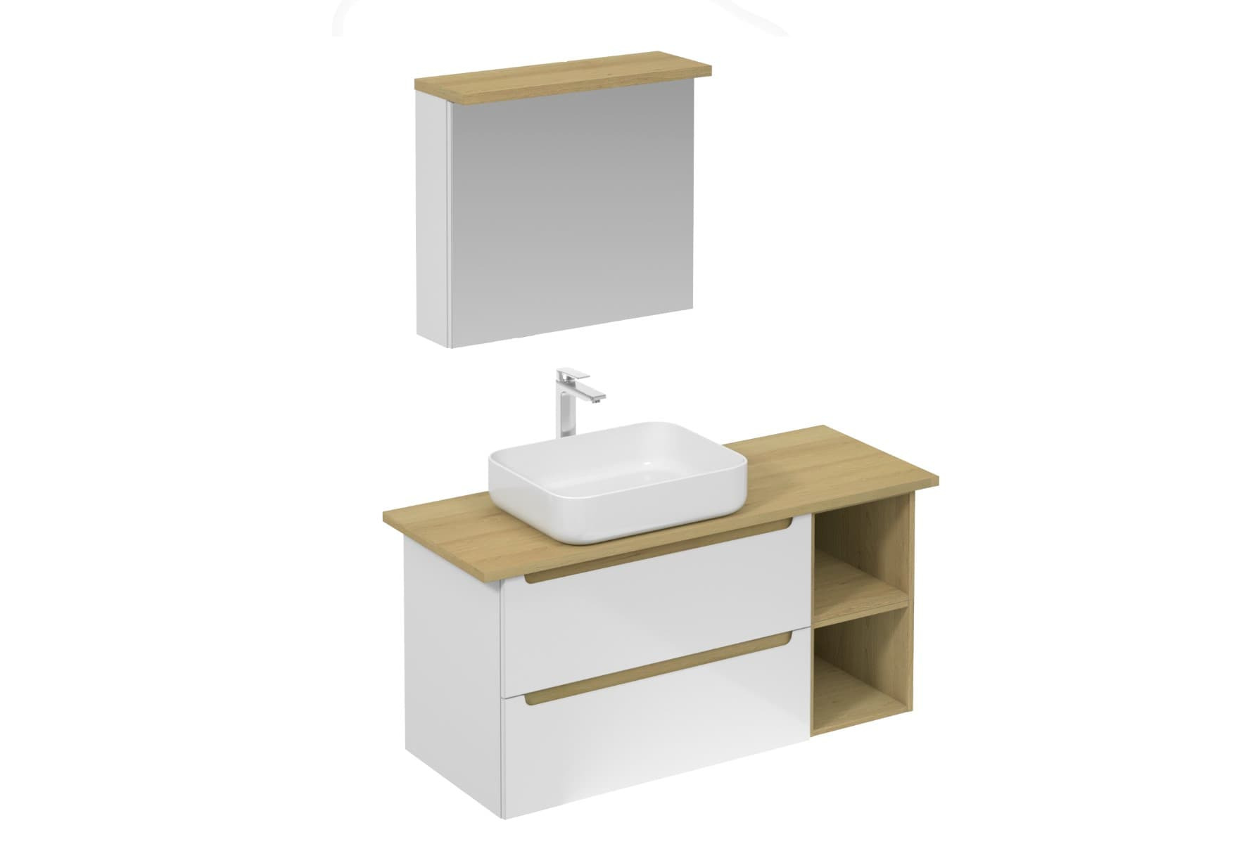 Ensemble de salle de bain mural avec lavabo en céramique blanc avec surface en mélaminé. Avec extension et portée complètes.