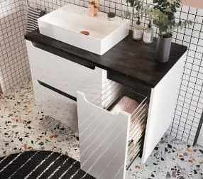 Meuble de salle de bain STILLAA03001KOS avec panier à linge intégré. La façade et le corps sont pourvus d'un vernis photopolymérisable. Derrière la poignée fraisée se trouve un panneau visible qui confère au meuble un caractère unique.