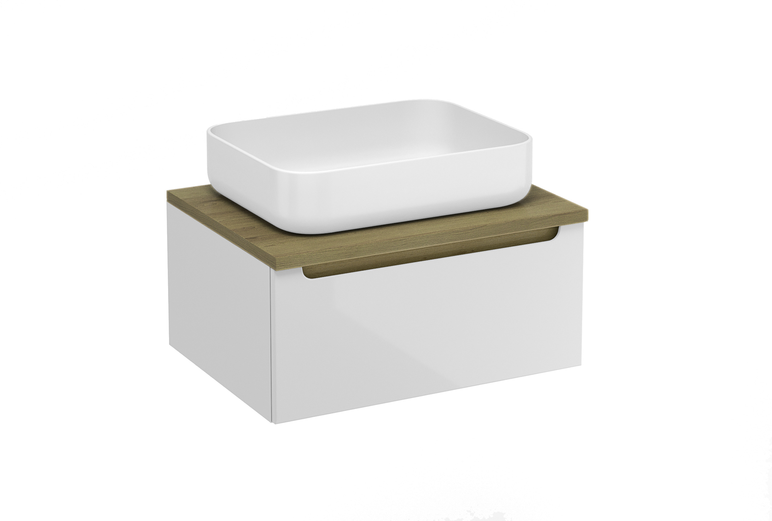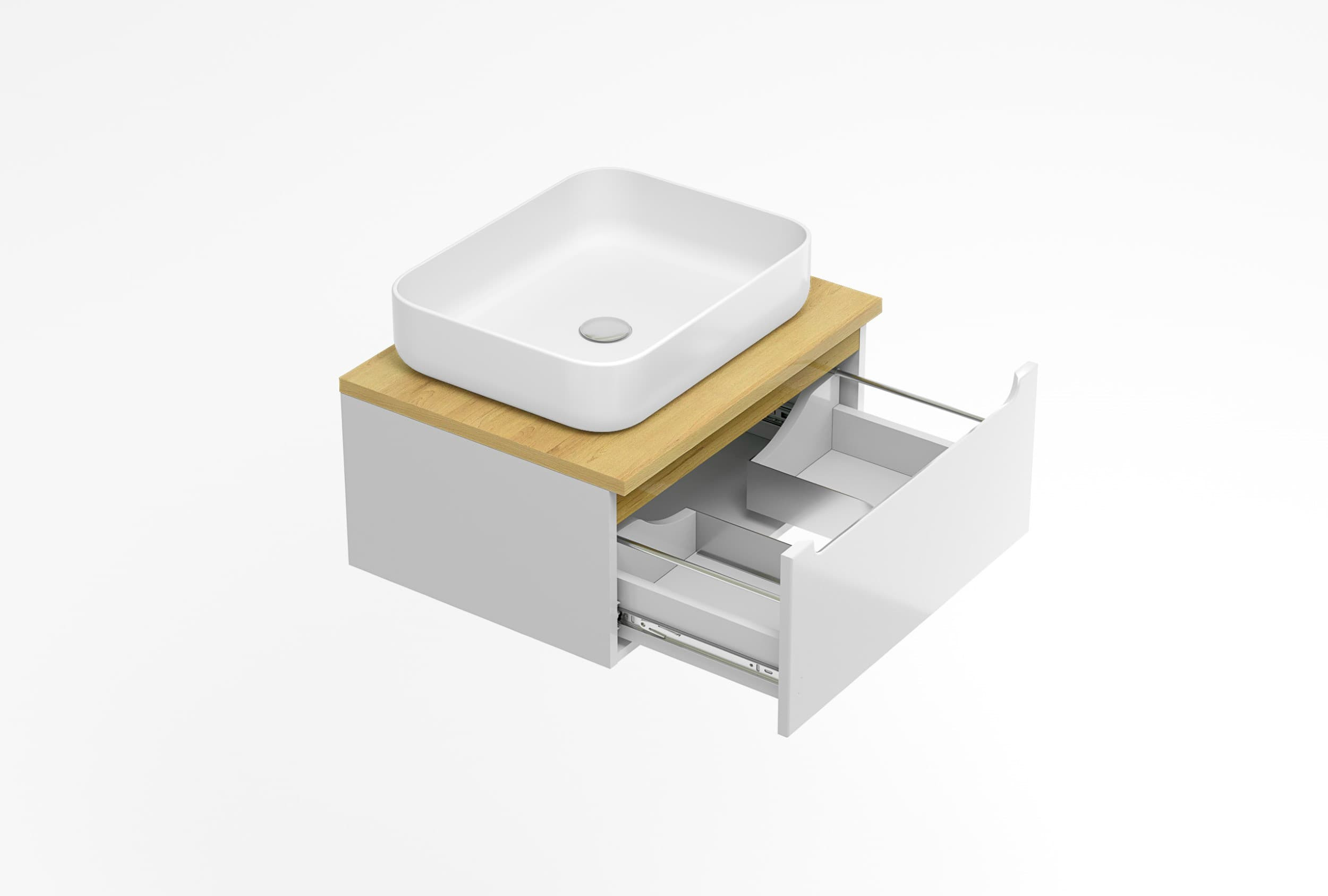 Meuble de salle de bain mural sous lavabo avec plateau STILLAF06006 couleur hêtre. Dimensions 60x30x45cm. Face avant en mélaminé laqué. Tiroir avec découpe pour siphon. Le produit est livré démonté, avec instructions de montage.