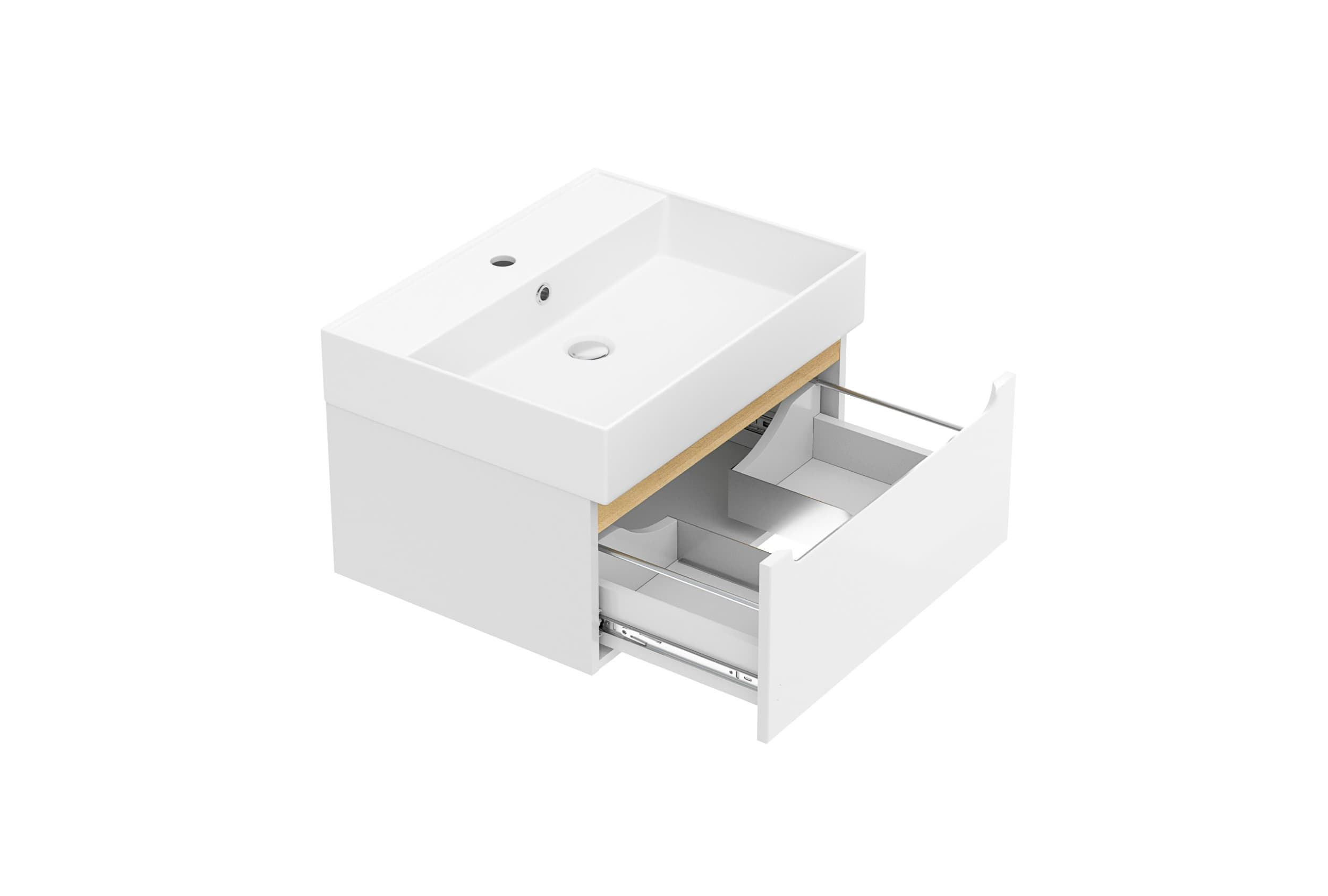 Meuble de salle de bain suspendu avec lavabo en céramique SATINF6046 en blanc. Dimensions 60x30x45cm. Face avant en mélaminé laqué. Tiroir avec découpe pour siphon. Le produit est livré démonté, avec instructions de montage.