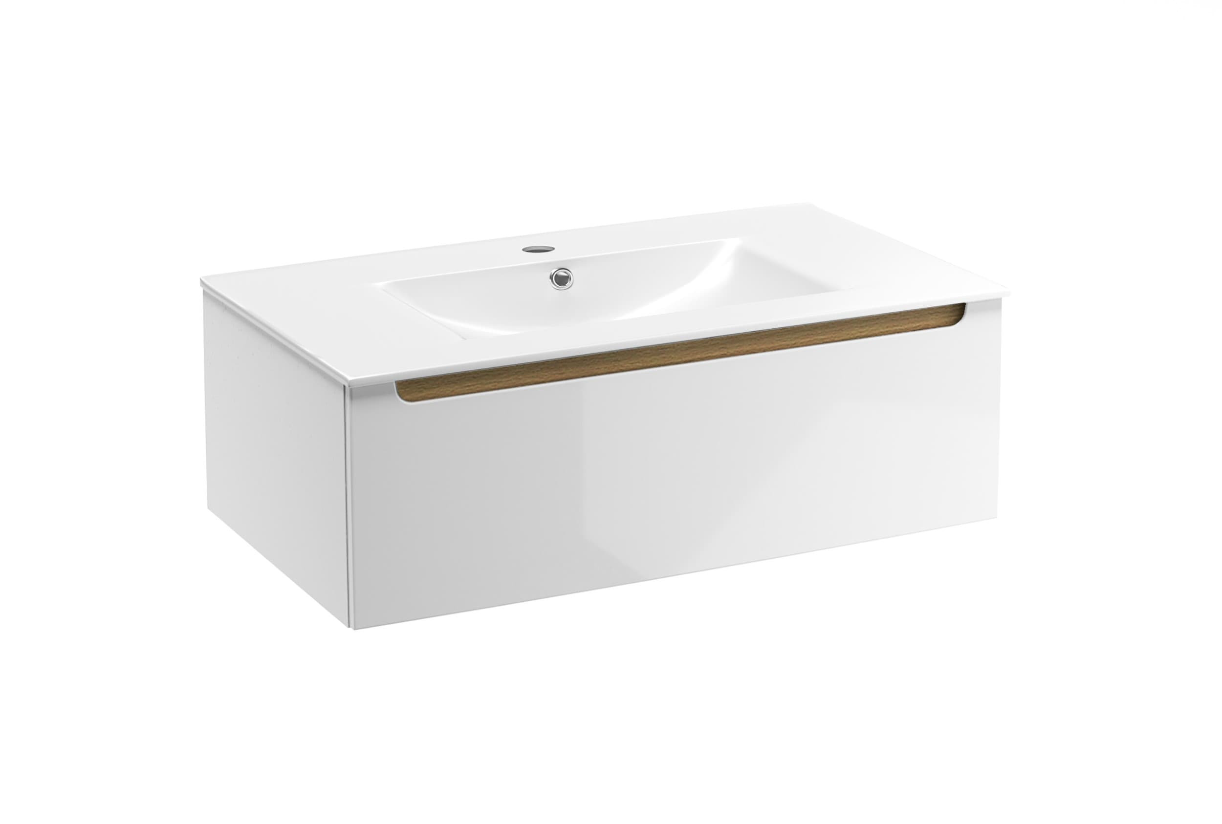 Ensemble de mobilier de salle de bain suspendu, comprenant un lavabo en céramique M8046 de couleur blanche. Les dimensions de l'ensemble sont de 80x30x45 cm. La façade avant est fabriquée en MDF laqué, offrant à la fois un design élégant et une durabilité accrue. Le tiroir est spécialement conçu avec une découpe pour accueillir le siphon, assurant une utilisation pratique de l'espace.