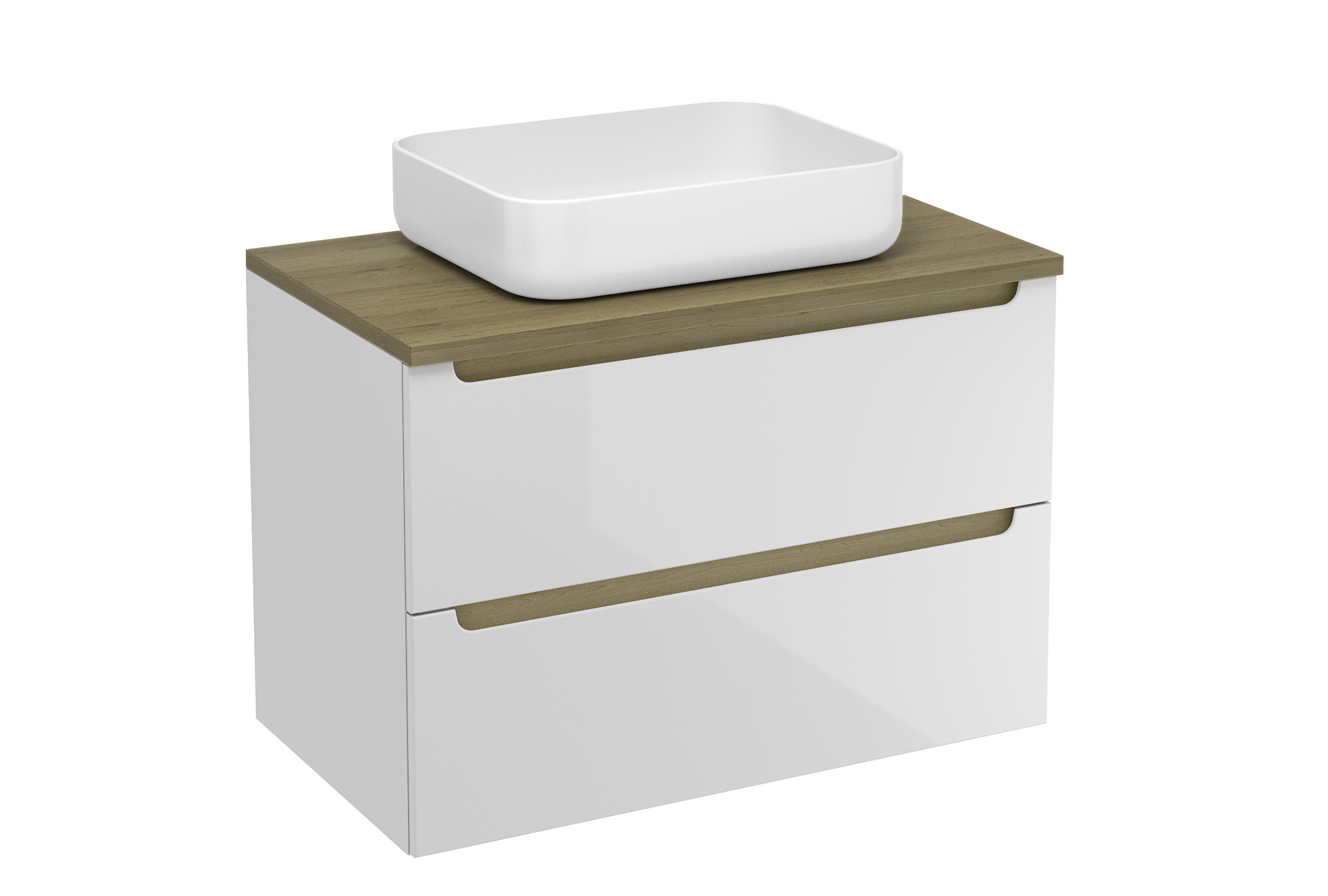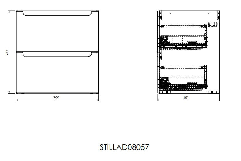 Découvrez le meuble de salle de bain suspendu Stilla, ses deux tiroirs de 80x60x45 cm et sa plaque de recouvrement de couleur hêtre.