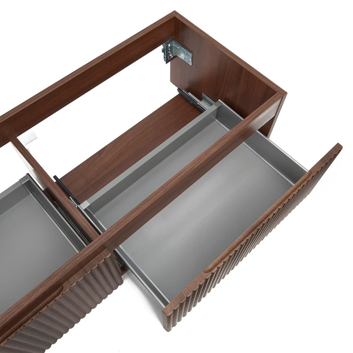 Le tiroir peut être ouvert en haut ou en bas de la façade du tiroir et offre ainsi un accès pratique à l'espace de rangement.