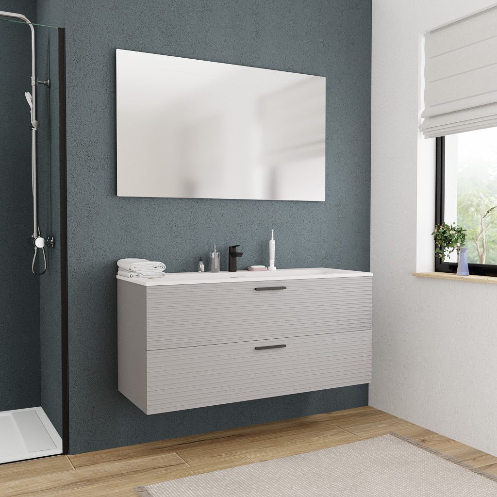 Ajoutez une touche contemporaine et raffinée à votre salle de bain avec le set complet Ceramia 120 cm gris perle, composé d’un meuble suspendu préassemblé et d’une vasque blanc mat intégrée. Son coloris gris perle mat, élégant et intemporel, s’harmonise facilement avec les ambiances modernes ou naturelles.