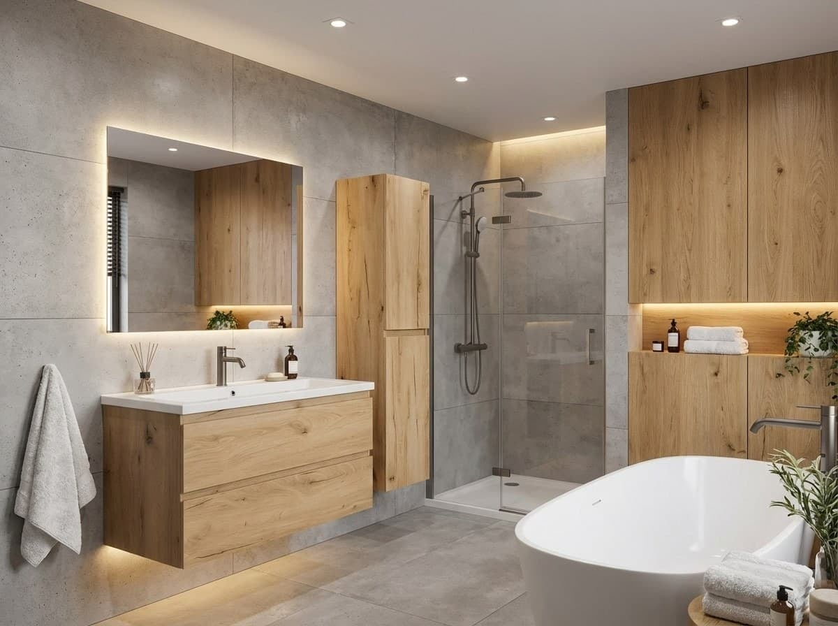L’ensemble de salle de bain SAT B-Way séduit par son esthétique naturelle et contemporaine, inspirée du décor chêne mat, qui apporte chaleur et élégance à la salle de bain.