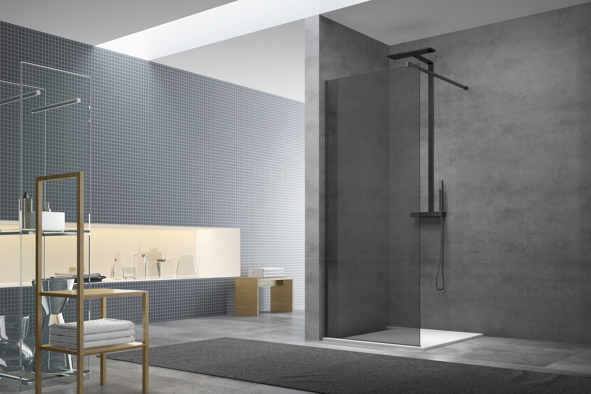 Cette offre complète comprend une paroi de douche à l'italienne en verre fumé Easy Clean de 8 mm d'épaisseur, offrant une esthétique moderne et un nettoyage facile grâce à son traitement anticalcaire.