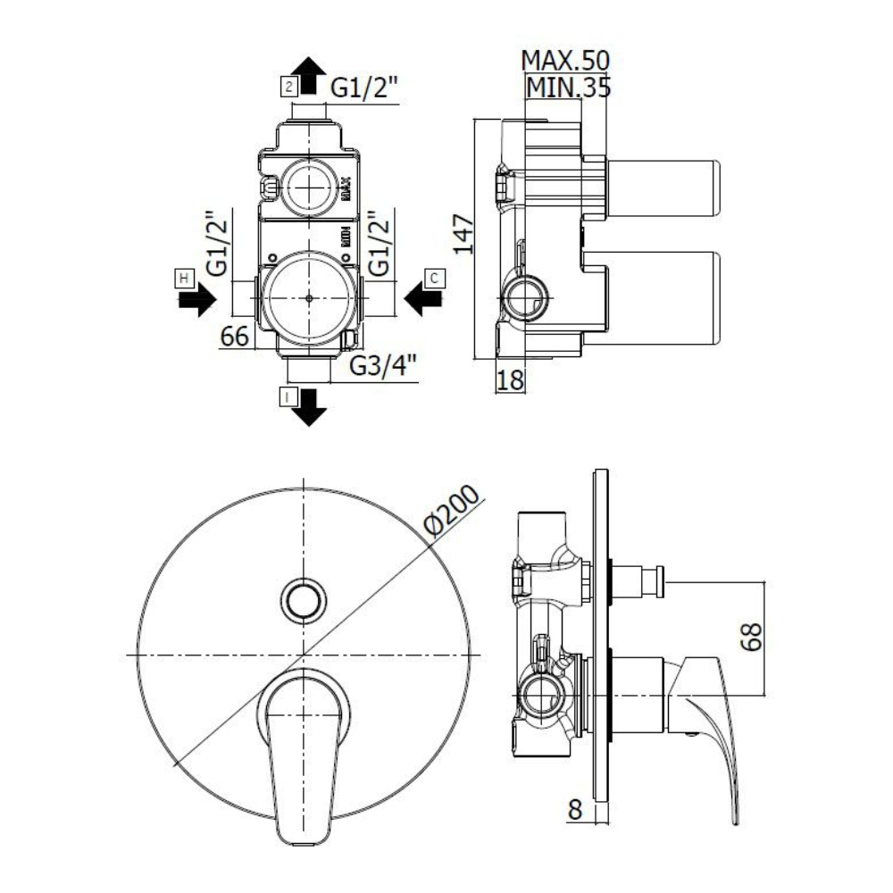 Caractéristiques du mitigeur baignoire à encastrer à levier, 2 sorties, corps d'encastrement inclus, Swiss Aqua Technologies Project, noir mat (SATBSPRO215C) :