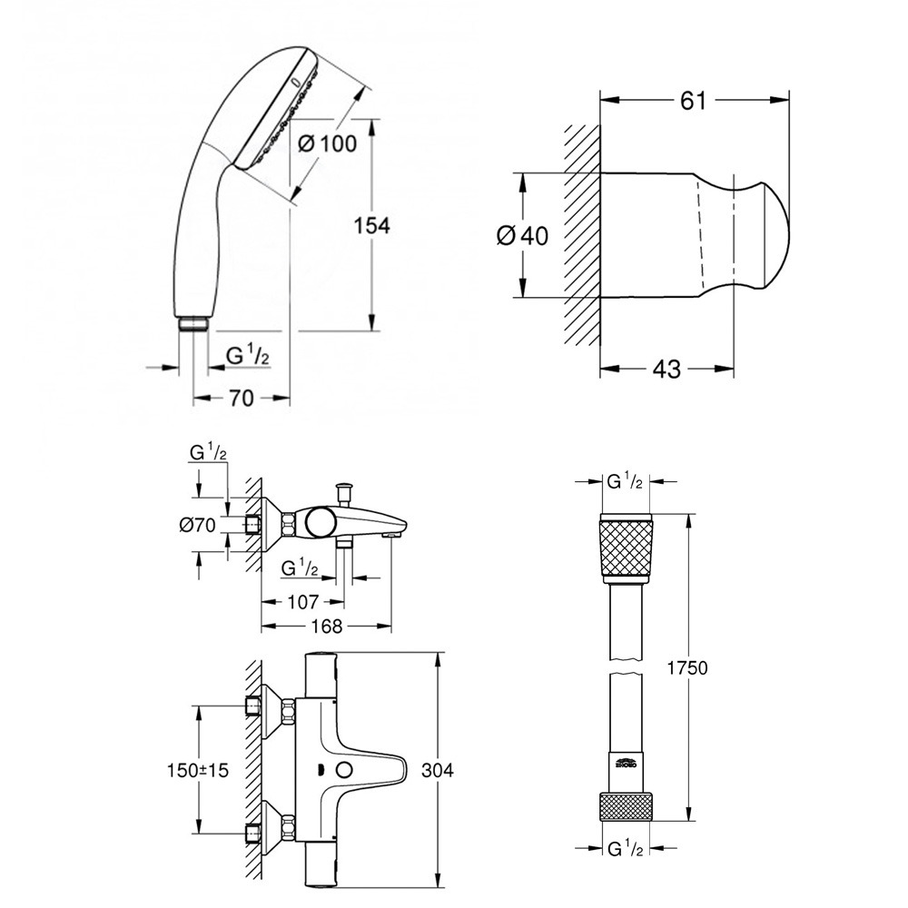 Grohe Set de douche mitigeur bain/douche thermostatique + Douchette 2 jets + support mural + Flexible 1750 mm, noir mat