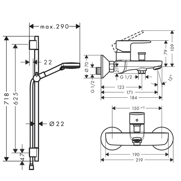 - Diamètre de la barre de douche: 22 mm
