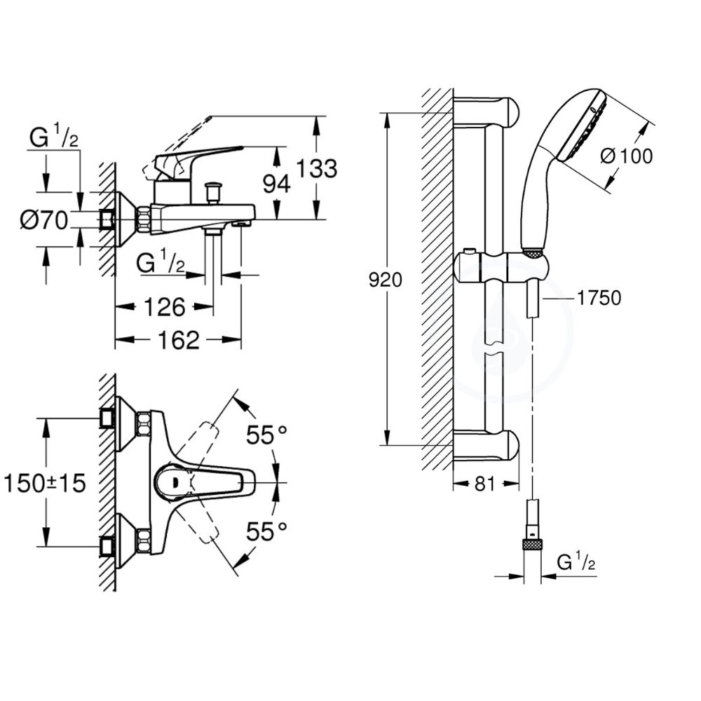 Caractéristiques de l'ensemble de douche complet 3 jets, Grohe Tempesta 100 + mitigeur de baignoire 1/2", Grohe BauFlow, chrome (23601000-28789002) :