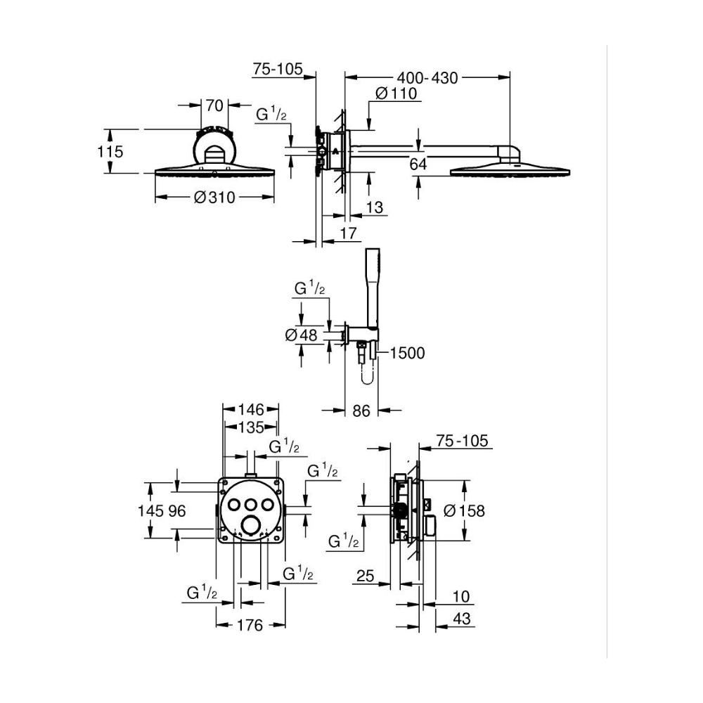Caractéristiques du set de douche encastré 2 jets avec mitigeur thermostatique, tête ronde Ø 31 cm, Grohe Precision SmartControl, noir mat (348742430) :