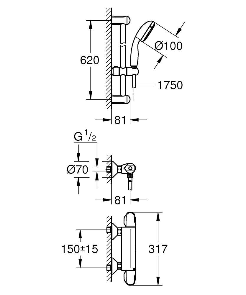 Grohe Grohtherm 1000 Set de douche mitigeur thermostatique + Tempesta douchette 2 jets, Chrome (34825001)