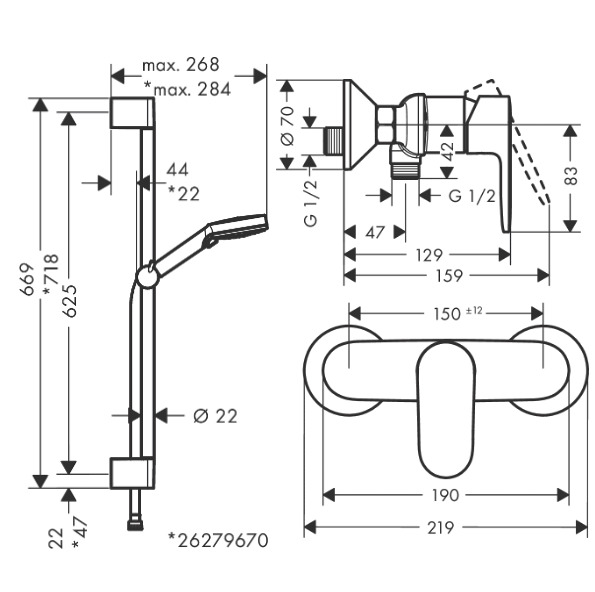 Caractéristiques du Set de douche mitigeur + Douchette à main 2 jets + Barre 65cm, Chrome, Hansgrohe Vernis Blend (71640000-Vernis) :