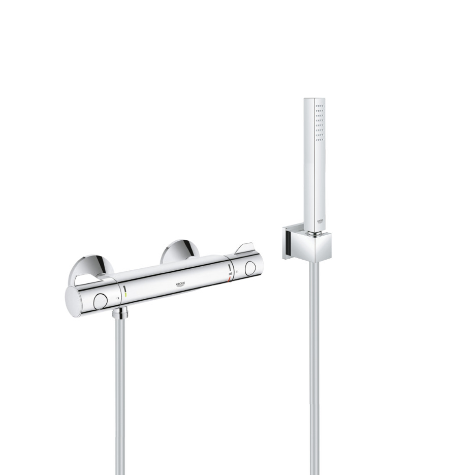 Grohe Set de douche Mitigeur thermostatique Grohtherm + Douchette Stick 1 jet, support mural, flexible, Chrome (34558000-CUBESTICK)