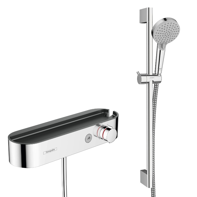 Laissez-vous séduire par ce Set Mitigeur thermostatique douche ShowerTablet Select + Douchette 105mm 2 jets + Barre 65cm, Chrome, Hansgrohe Vernis Pulsify (24360000-Vernis).