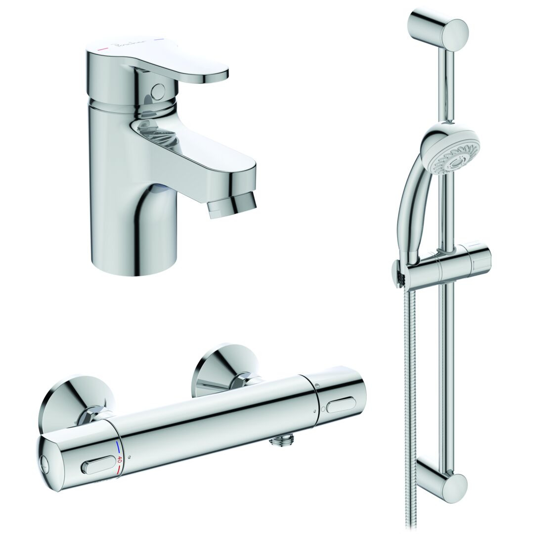 Ideal Standard Olyos Set Mitigeur thermostatique + Barre de douche 60cm avec Douchette 2 jets + Mitigeur lavabo OFFERT