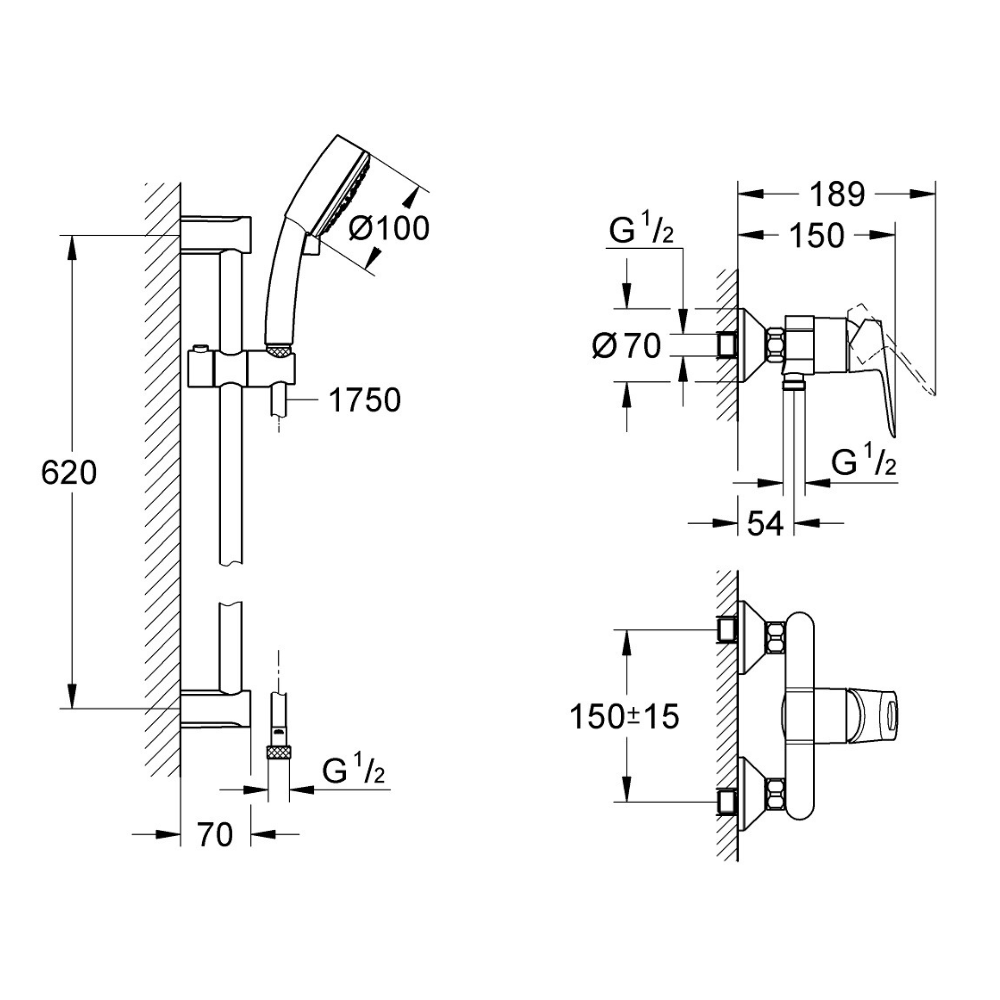 Caractéristiques de l'ensemble de douche 2 jets, Grohe New Tempesta Cosmopolitan 100 + mitigeur monocommande avec clapet anti-retour, Grohe Start Loop, chrome (23354000-26076002) :