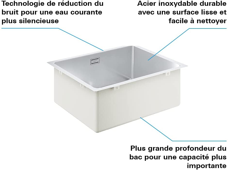 Caractéristiques de l'Evier sous-plan 550 x 450mm + Siphon, bonde et vidage inclus, Acier inoxydable, Grohe K700 (31574SD1) :