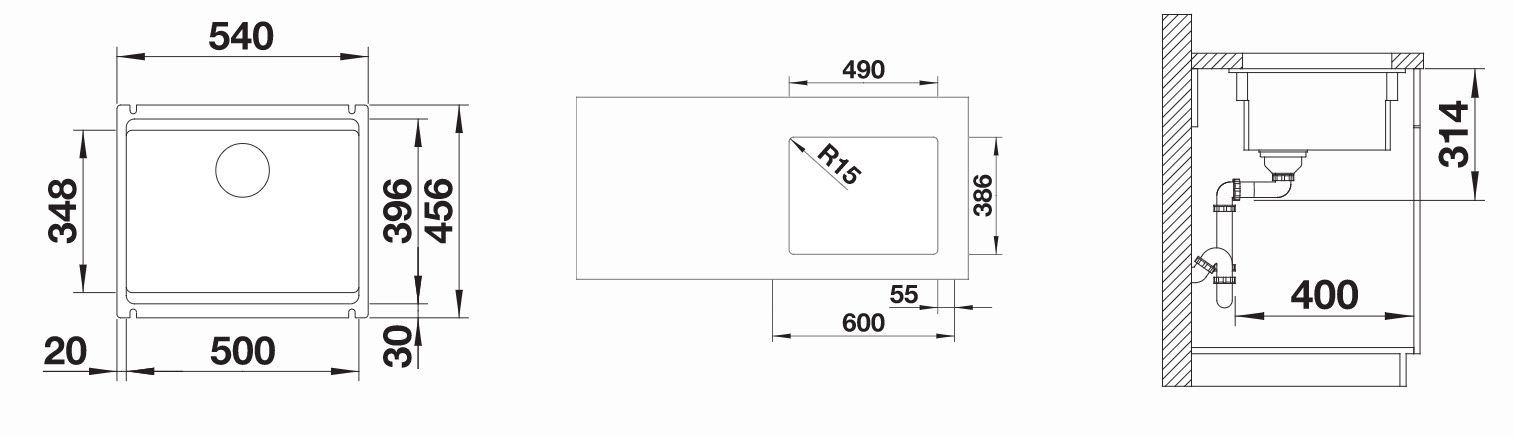 Caractéristiques de l'Evier ETAGON-U 500-U Céramique PuraPlus avec grande cuve à étages 54x45.6 + 2 rails + siphon inclus, Noir (525155) :