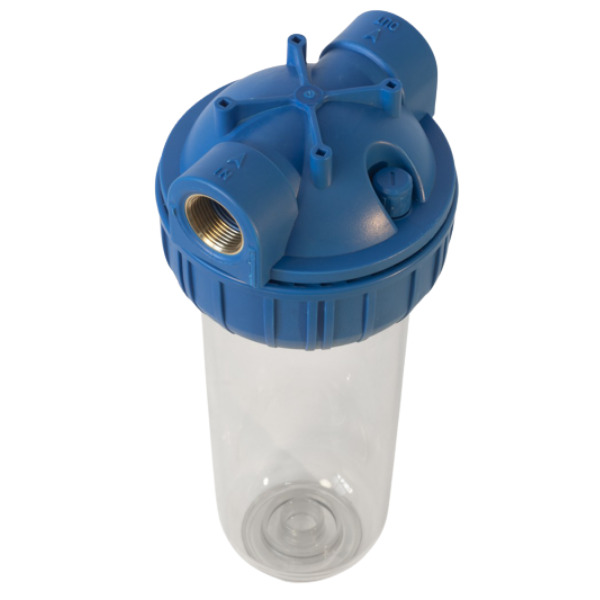 - La tête est équipée de raccords en laiton 3/4 "pour l'entrée et la sortie d'eau et d'une soupape de surpression qui libère la pression lors du remplacement de l'élément filtrant.