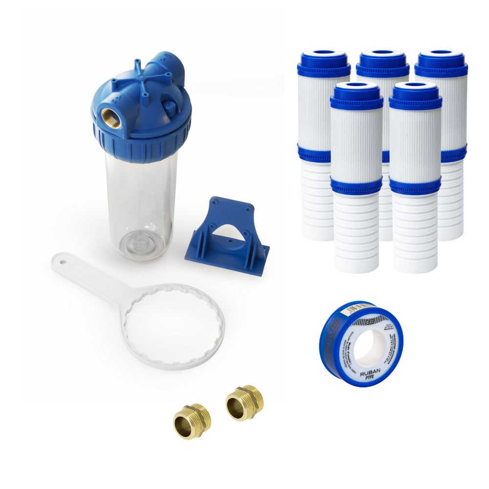 Swiss Aqua Technologies Bol pour filtres universels 10", raccord 3/4", livré complet et prêt à raccorder, avec 5 filtres, charbon actif (SATHF34X5)