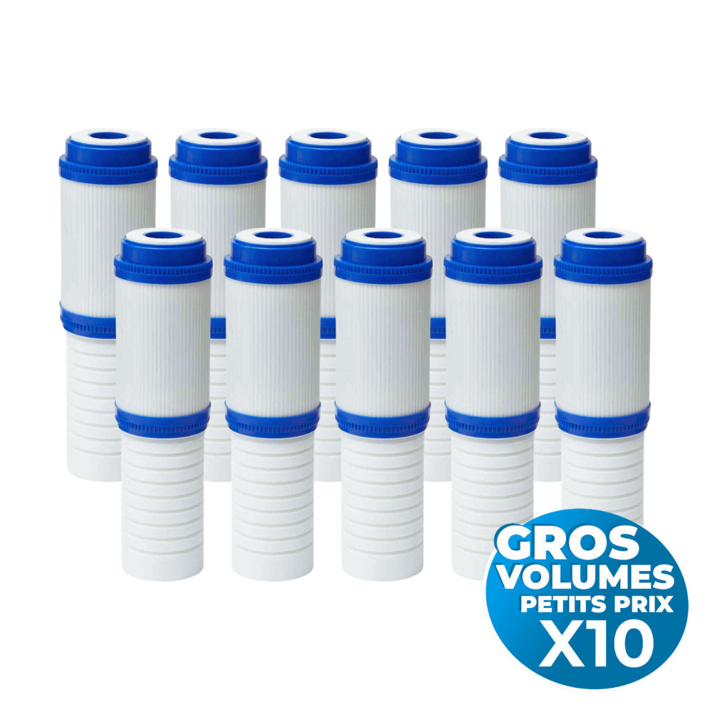 Voici un lot de 10 filtres 10 microns à double étape particulièrement efficace et économique. Ces filtres éliminent efficacement les impuretés indésirables de l'eau, tout en améliorant sont goût et son odeur de manière naturelle grâce au charbon actif.