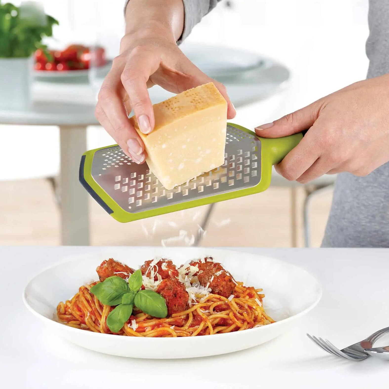 - Chaque grattoir a deux positions de poignées : Une droite pour gratter directement les aliments ou une à un angle de 90 ° pour un maintien supplémentaire lorsque vous grattez des volumes plus importants