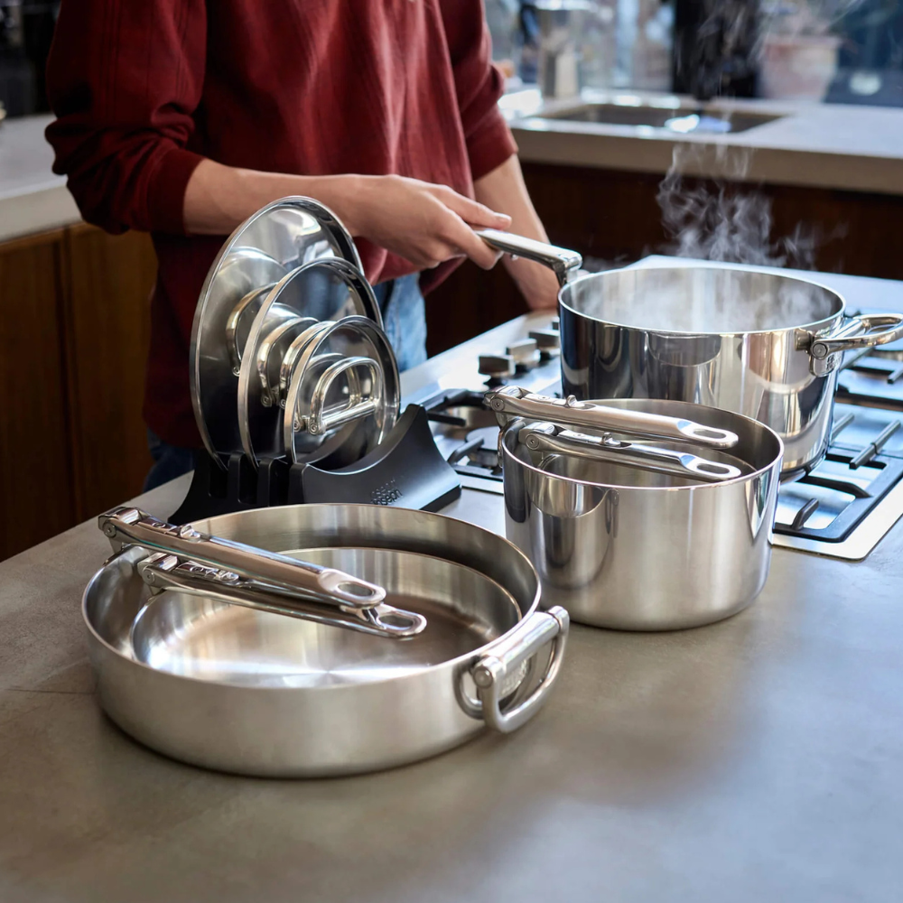 - Comprend trois casseroles avec couvercles, deux poêles, un porte-couvercles et trois protections de casserole en feutre.