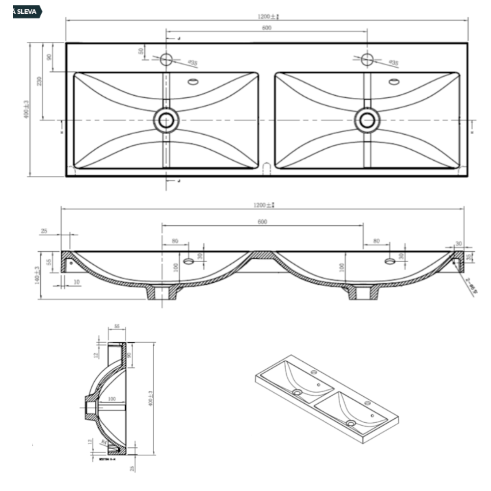Caractéristiques de la double vasque 120x40x5,5 cm en marbre coulé avec deux trous pour robinetterie, Swiss Aqua Technologies Cube Way, blanc brillant (CU212050) :