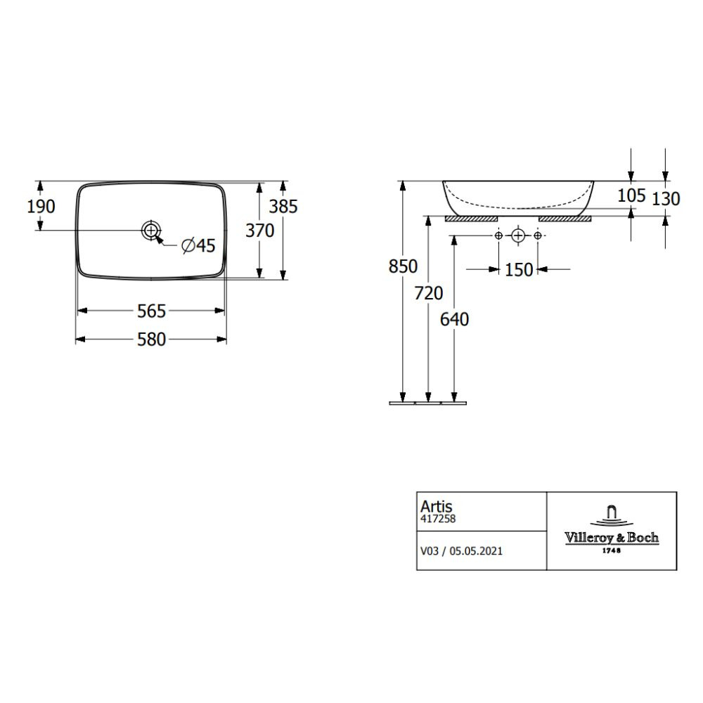 Caractéristiques de la vasque à poser Artis , 580 x 385 x 130 mm, Blanc CeramicPlus, sans trop-plein (417258R1):