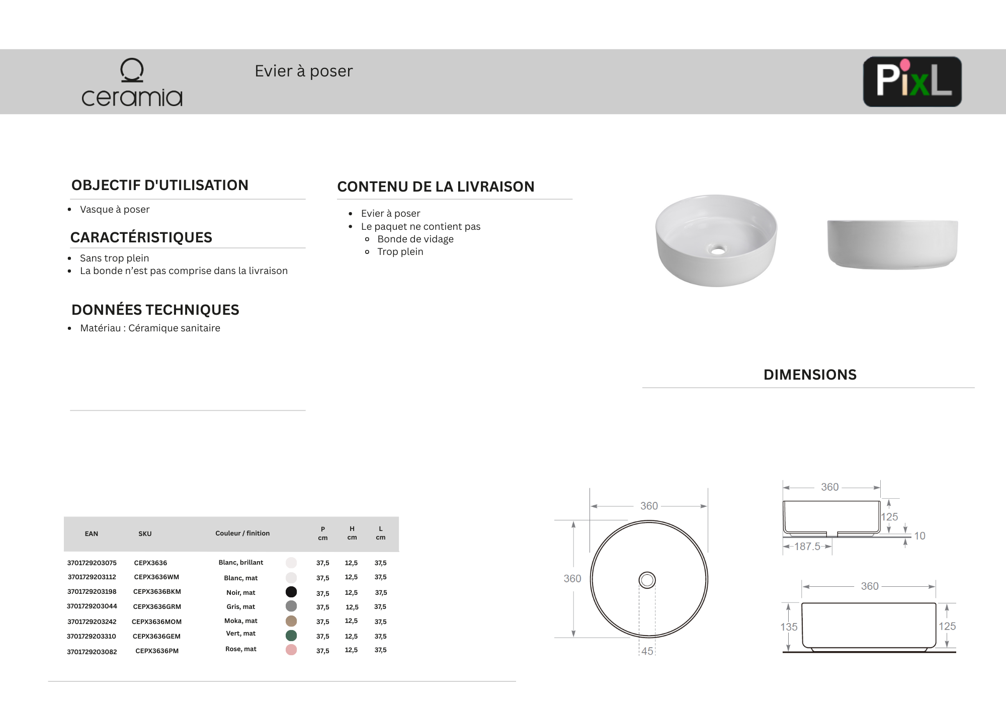 Caractéristiques de la vasque à poser Infinitio 36 x 12,5 cm, sans trop-plein, Ceramia PixL, moka mat (CEPX3636MOM) :