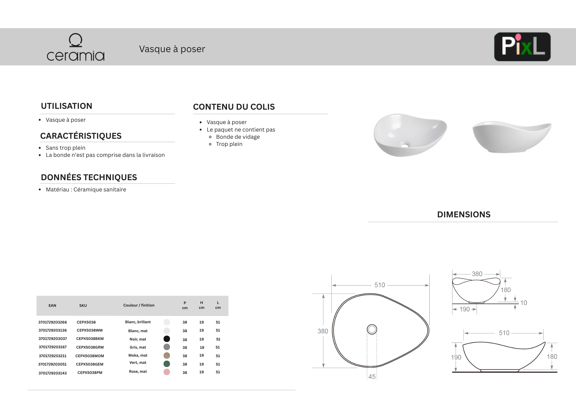 Caractéristiques de la vasque à poser 51x38x19 cm Ceramia PixL + Swiss Aqua Technologies Mood mitigeur lavabo XL + Ceramia PixL bonde (CEPX505PMSAT285C) :