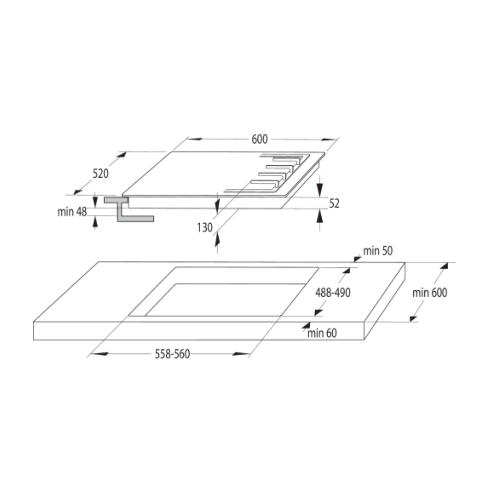 - Dimensions d’encastrement : env. 56 × 49 cm (hauteur min. 10-13 cm)