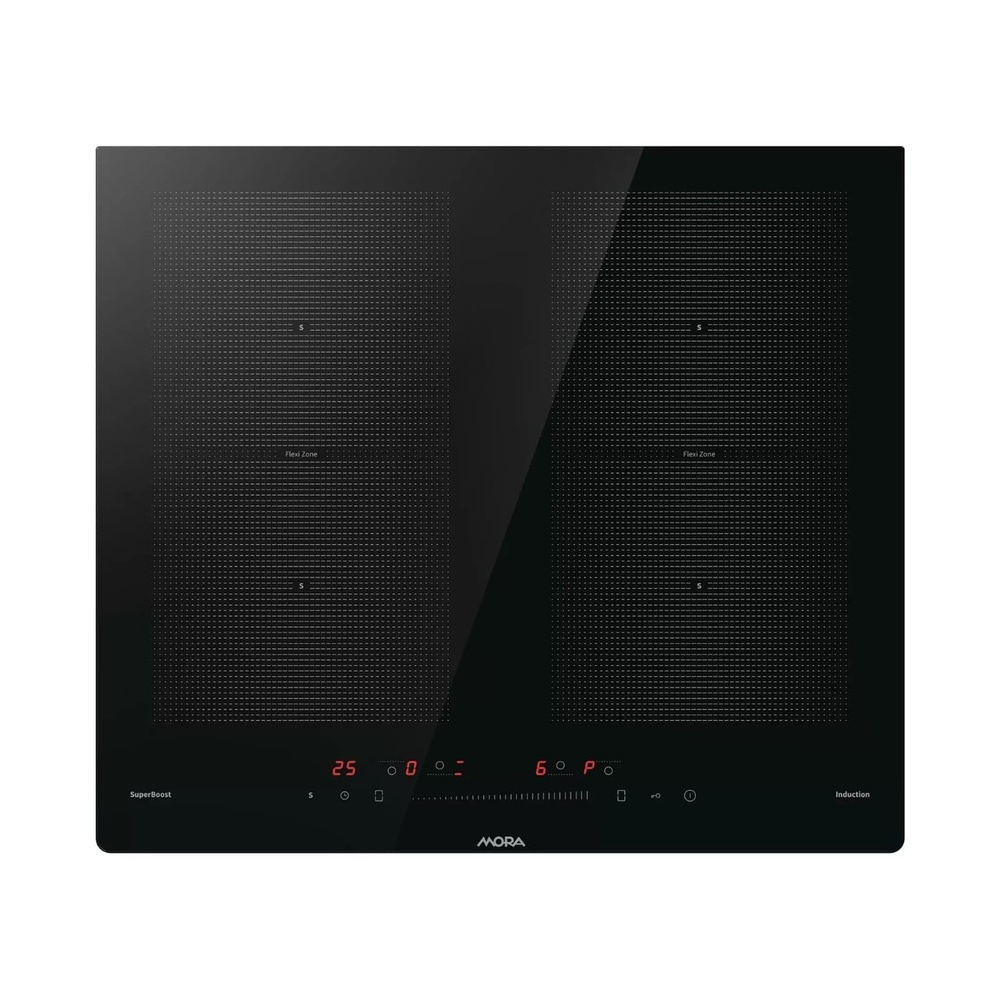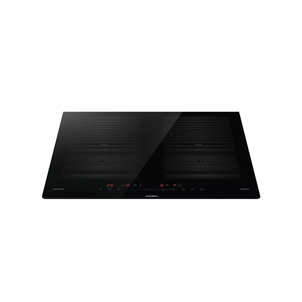 Table de cuisson à induction Mora d'une largeur de 59 cm et de couleur noire. Le nombre de plaques de cuisson est de 4 et la tension d'alimentation (VOVO) : 220-240.